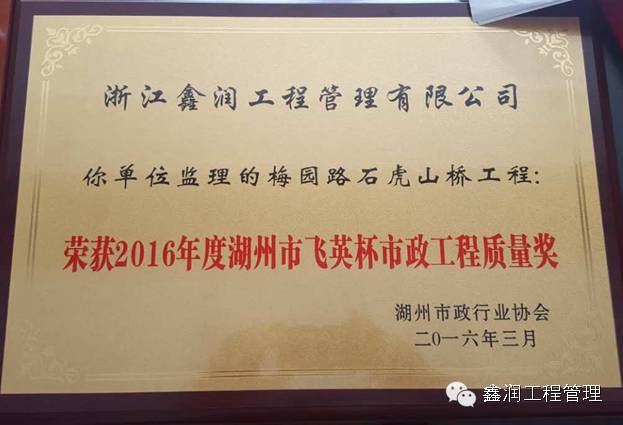 我單位監(jiān)理的梅園路石虎山橋工程榮獲"2016年度湖州市飛英杯市政工程質(zhì)量獎(jiǎng)"