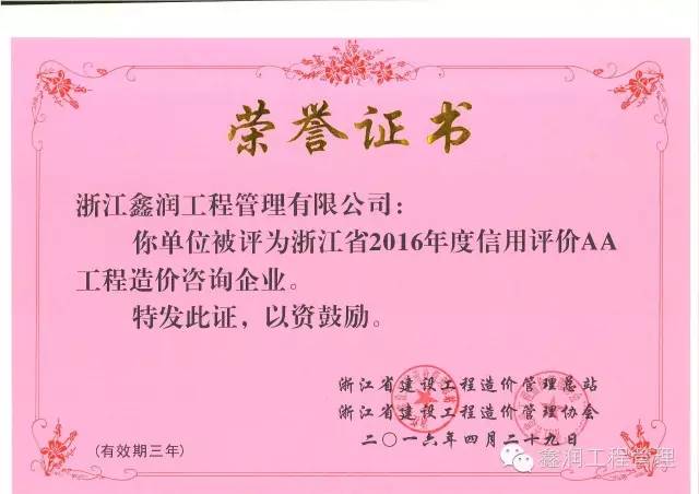 經(jīng)過市造價(jià)管理機(jī)構(gòu)(造價(jià)管理協(xié)會(huì))對(duì)企業(yè)現(xiàn)場(chǎng)考核評(píng)定和省造價(jià)管理總站聯(lián)合省造價(jià)管理協(xié)會(huì)組織專家對(duì)上報(bào)資料進(jìn)行復(fù)核抽查后,浙江鑫潤工程管理有限公司被評(píng)為浙江省2016年度信用評(píng)價(jià)AA工程造價(jià)咨詢企業(yè)。